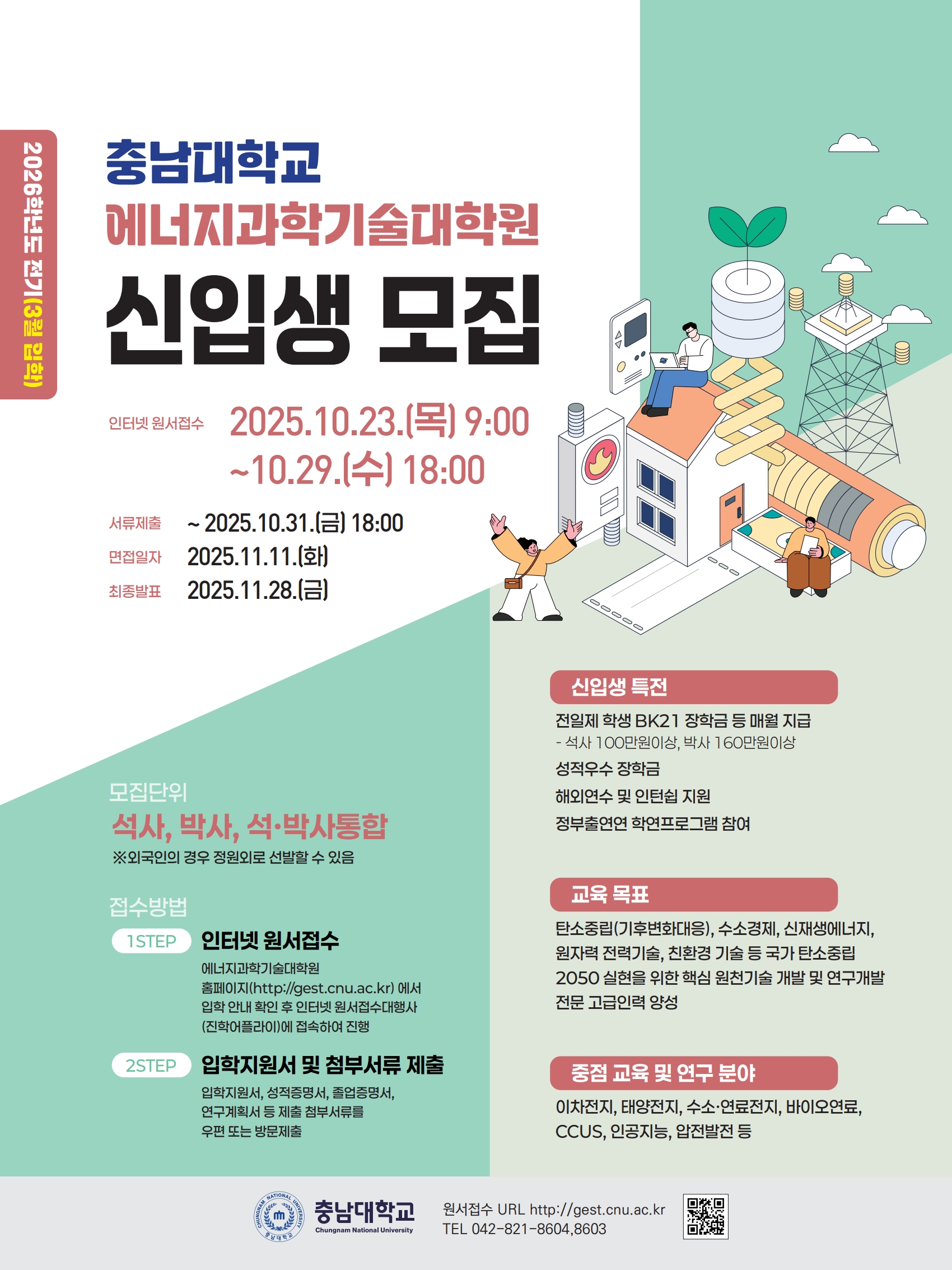 Home 학교생활 새소식 KIER STORY FAQ Q&A UST SCHOOL 공유하기 페이스북 트위터 링크 복사하기 인쇄 새소식 2026학년도 전기 에너지과학기술대학원 신입생 모집 작성일 2025-09-29 조회수 95 Attached File 에너지과학기술대학원 신입생모집 홈페이지용.jpg(266KB) 다운로드 2026_전기_에너지과학기술대학원_신입생_모집요강.pdf(469KB) 다운로드 목록 다음글 2025 유성구 청년역량강화프로그램 「청년취업 Jump-up 프로젝트」